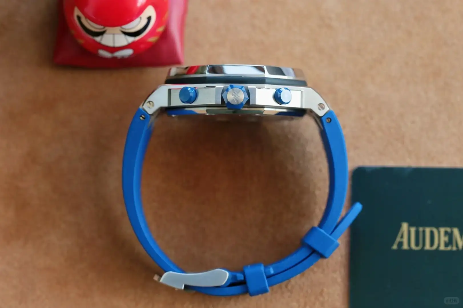- Dial: Features a striking blue dial with a “Méga Tapisserie” pattern, complemented by white hour markers and chronograph sub – dials, along with bold red accents. The design integrates sporty chronograph functionality with visual appeal, embodying the essence of Audemars Piguet’s innovative take on the Royal Oak Offshore’s iconic style, allowing for easy reading of time and precise chronograph measurements.