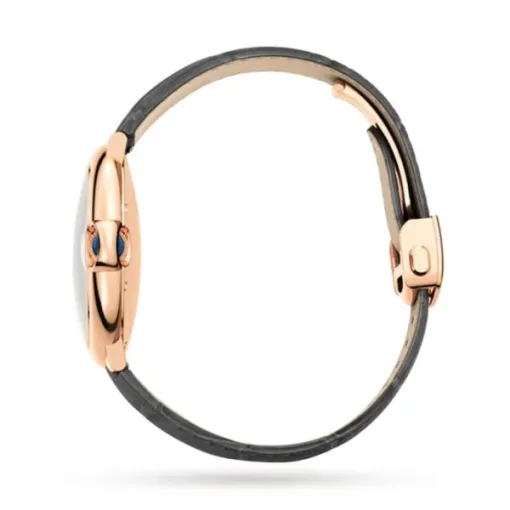 3. Grey Alligator Leather Strap: Luxurious texture, secured by a rose gold deployment clasp for a refined fit.