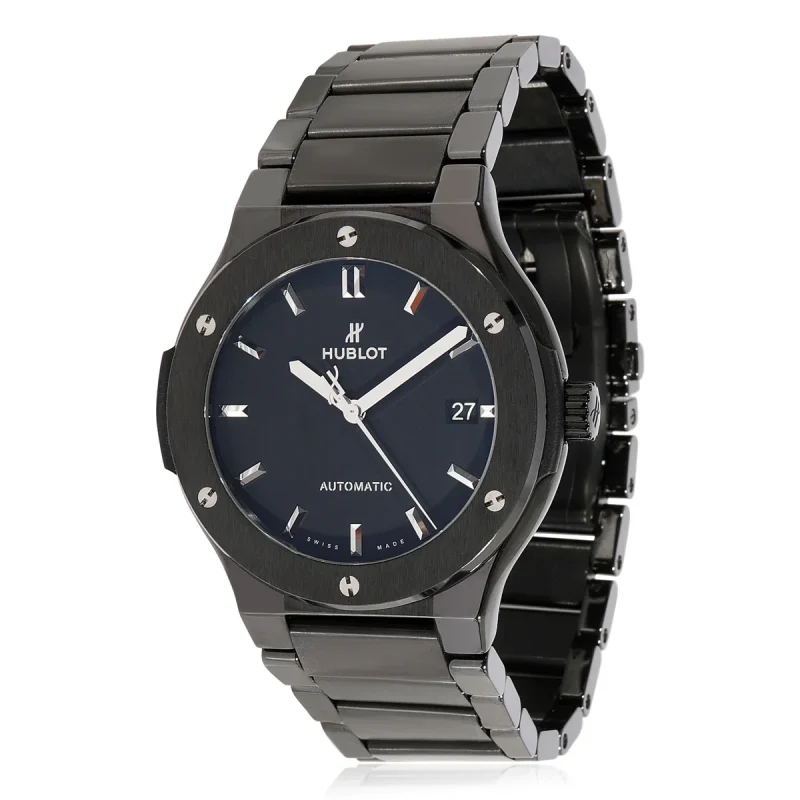 Experience the pinnacle of modern – classic luxury watchmaking with the Hublot Classic Fusion Automatic Watch. This exceptional timepiece combines a refined all – black ceramic design with traditional high – performance craftsmanship, showcasing the brandâs mastery in blending elegance and advanced horology. The in – house movement ensures precision and reliability, while the integrated ceramic bracelet and sophisticated dial exude a sleek, contemporary charm. Whether youâre attending a formal event or seeking a timeless piece for your collection, it delivers on both aesthetic allure and technical excellence. A must – have for watch enthusiasts who value the fusion of classic design, cutting – edge movement technology, and innovative materials, serving as a symbol of refined taste and horological sophistication.