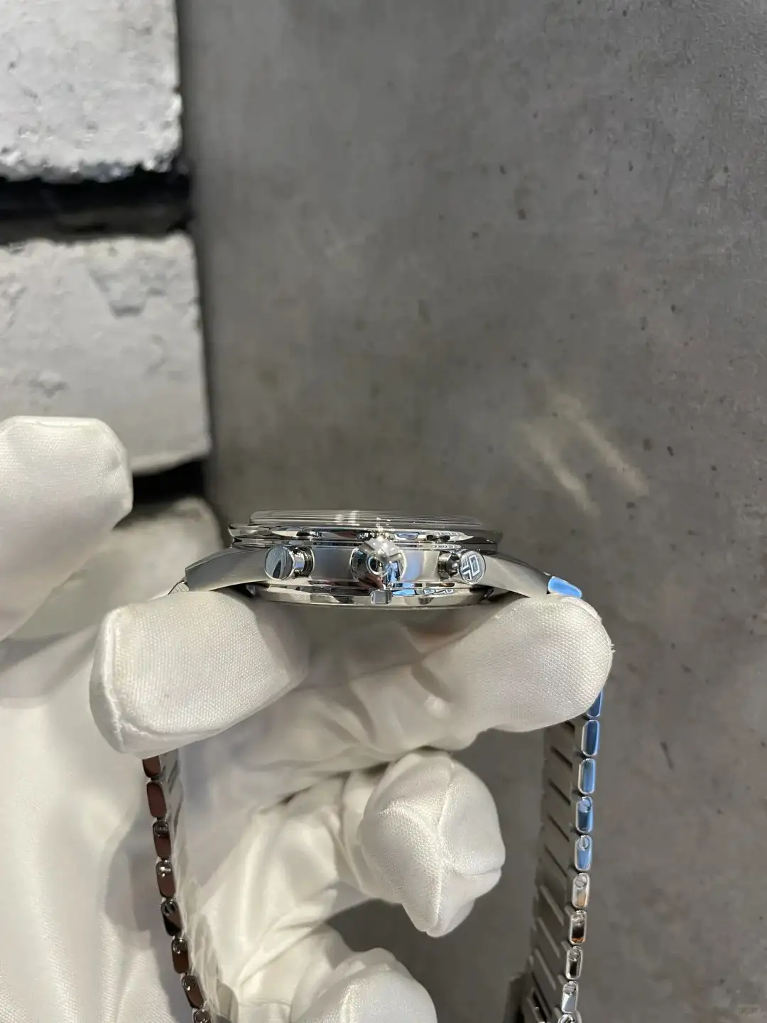 Blue Chronograph Dial: Features luminous hour markers, sub – dials, and a date window at 6 o’clock.