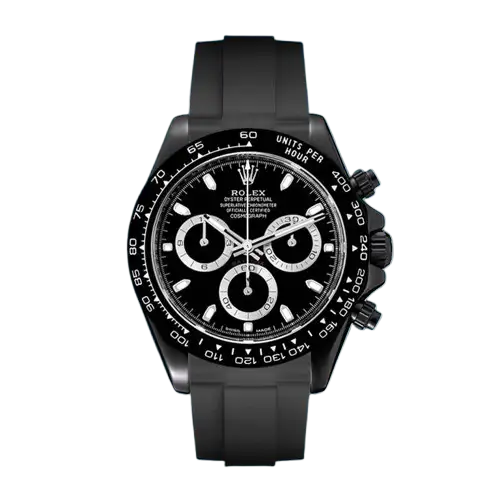 SALE! A bold all-black Rolex Daytona with a black “panda” dial, black rubber strap, and Cerachrom bezel. Merges sporty chronograph performance (tachymeter, luminous hands) with modern luxury (diamond-cut markers, durable build). Perfect for collectors—sleek, versatile, and iconic. Now discounted, ideal for everyday wear or special moments, embodying Rolex’s precision and style.