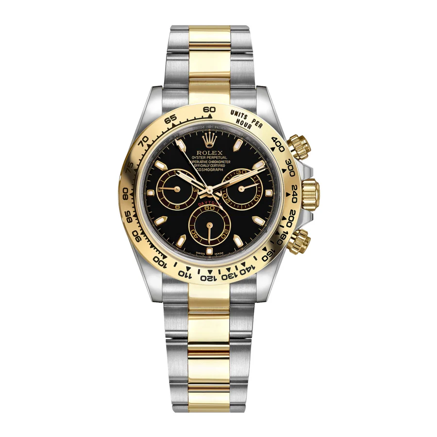 Two-tone Rolex Daytona (black dial, gold accents, Cerachrom bezel). Merges chrono performance (tachymeter, luminous hands) with luxury (two-tone metal, diamond markers). Perfect for collectors – sleek, precise, versatile. Embodying Rolex’s legacy, ideal for any occasion (sporty to elegant), a timeless blend of style and durability.