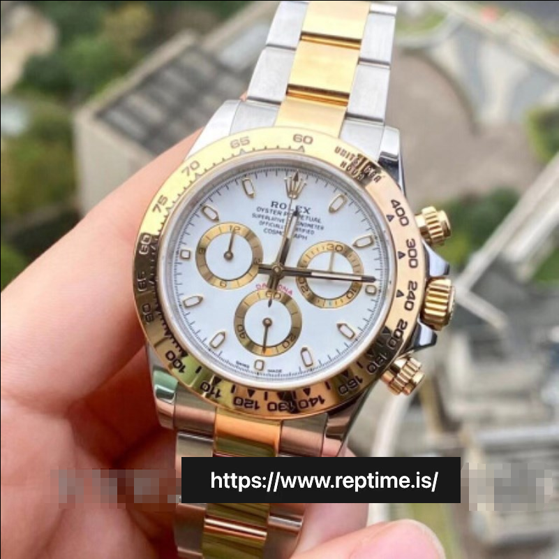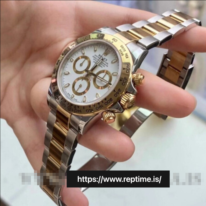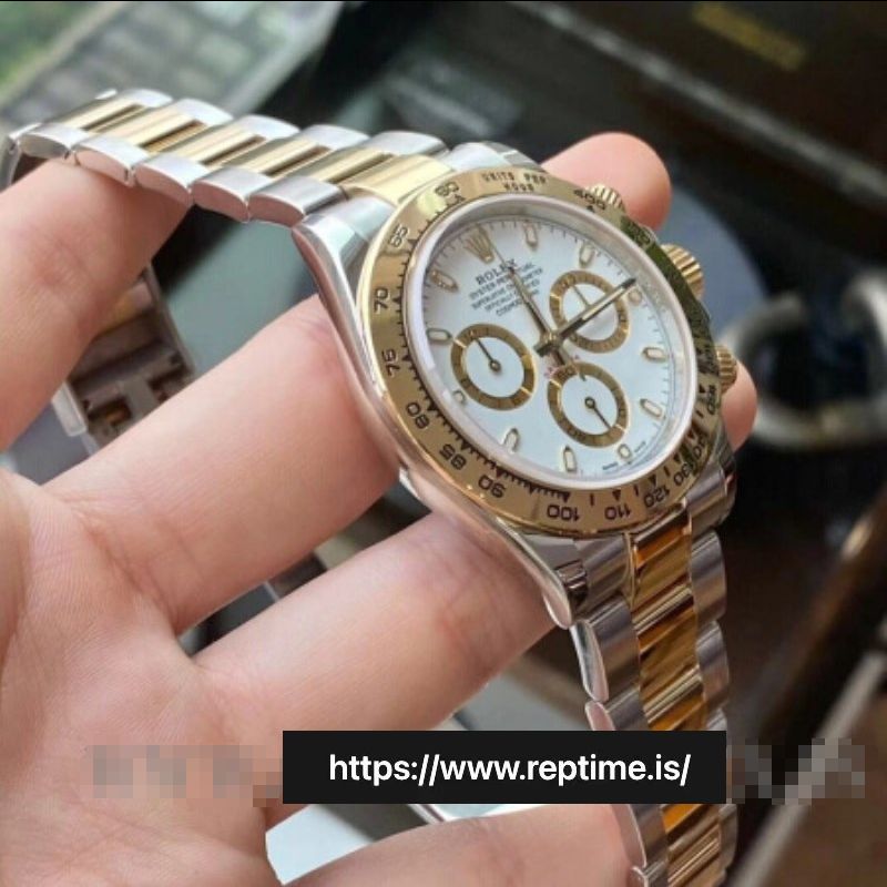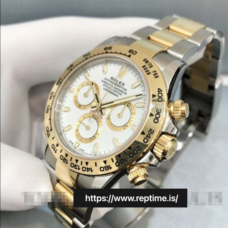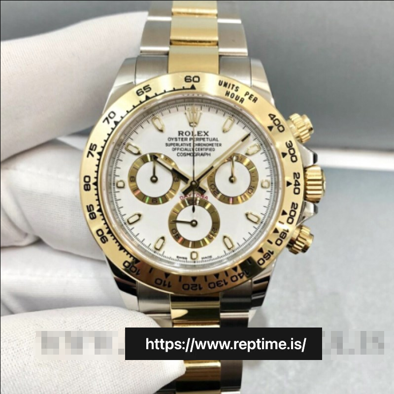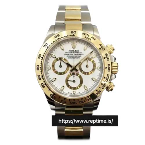 Two-tone Rolex Daytona (white dial, gold accents, Cerachrom bezel). Merges chrono performance (tachymeter, luminous hands) with luxury (two-tone metal, diamond markers). Perfect for collectors – sleek, precise, versatile. Embodying Rolex’s legacy, ideal for any occasion (formal to sporty), a timeless blend of style and durability.