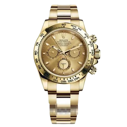 Full 18K gold Rolex Daytona with champagne dial, gold accents, and Cerachrom bezel. Merges chrono performance (tachymeter, luminous hands) with luxury (gold build, diamond markers). Perfect for collectors – sleek, precise, opulent. Ideal for high-end moments, embodying Rolex’s design and precision legacy in a timeless gold package.