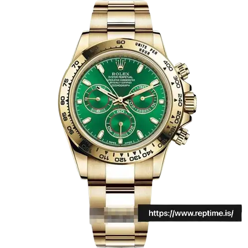Full 18K gold Rolex Daytona with vibrant green dial, gold accents, and black Cerachrom bezel. Merges chrono performance (tachymeter, luminous hands) with luxury (gold build, diamond markers). Perfect for collectors seeking bold opulence – sleek, precise, eye-catching. Ideal for making a statement, embodying Rolex’s design and precision legacy in a unique green-gold package.