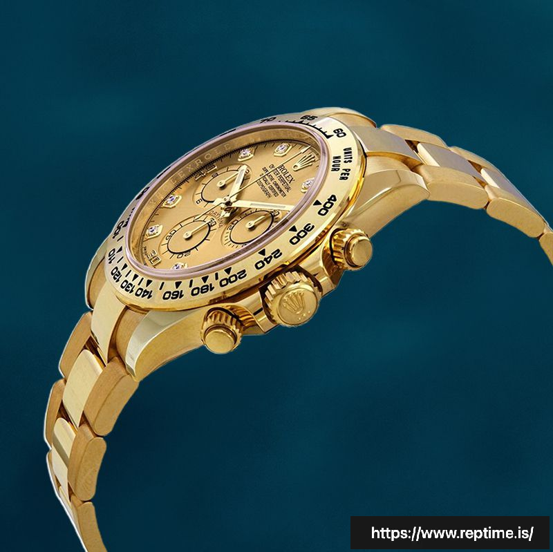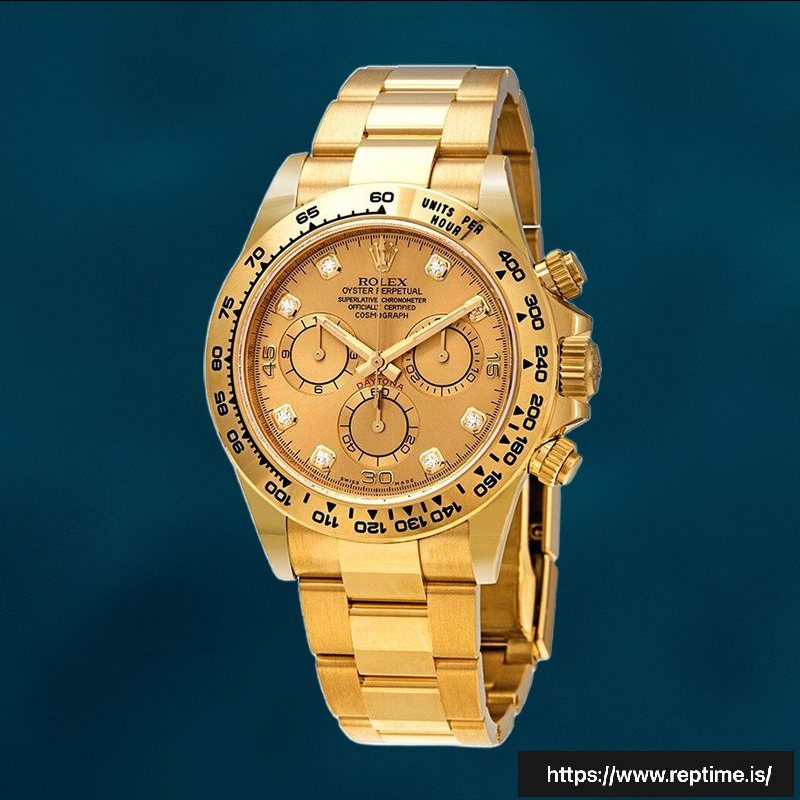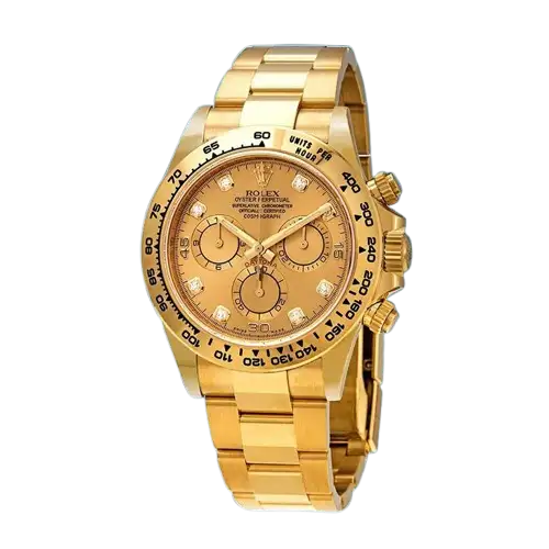 18K gold Rolex Daytona with champagne diamond dial, gold accents, and Cerachrom bezel. Merges chrono performance (tachymeter, luminous hands) with luxury (gold build, diamonds). Ideal for collectors, elegant for any occasion, embodying Rolex’s precision and style legacy.