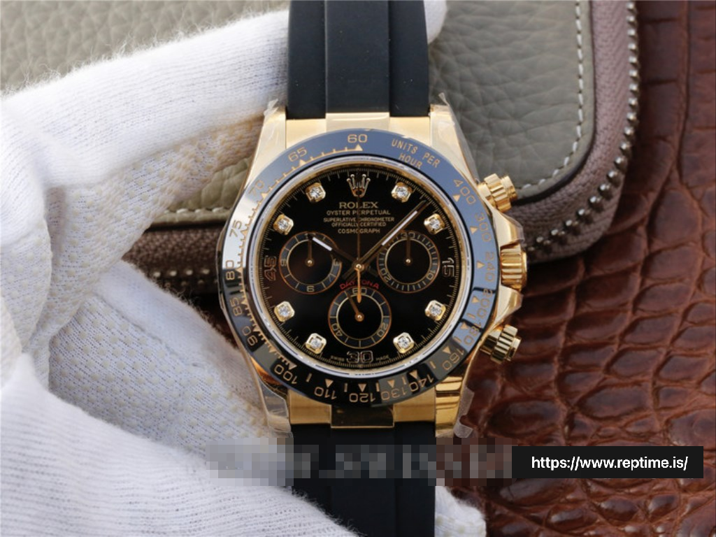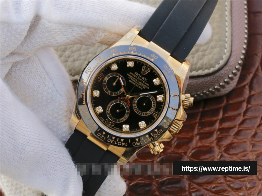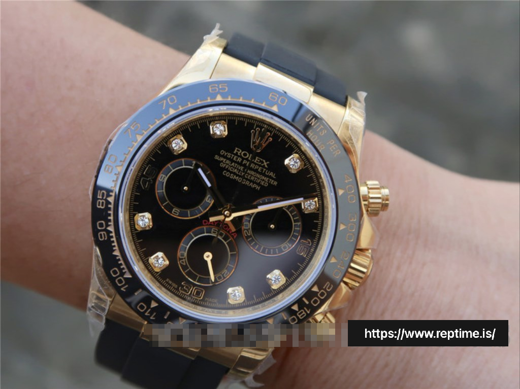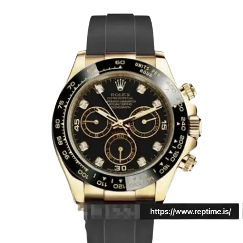 - Black Dial with Gold Sub-Dials & Diamond Markers: Striking black base, gold chronograph sub-dials, and diamond hour markers, creating a luxurious contrast with the gold case.