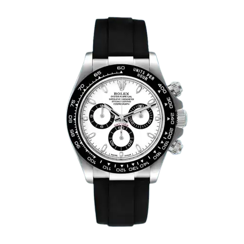 Stainless steel Rolex Cosmograph Daytona with a white dial, black sub-dials, black Oysterflex strap, and black Cerachrom bezel. This timepiece merges high-performance chronograph functionality (tachymeter, luminous hands) with a sleek, sporty design. The stainless steel case and black rubber strap offer durability and comfort, while the white dial with black accents delivers crisp readability. Ideal for both racing-inspired precision and everyday elegance, it embodies Rolex’s legacy of technical excellence and timeless style. Perfect for collectors and enthusiasts, this Daytona balances sportiness and sophistication, making it a versatile choice for any occasion—from high-speed pursuits to formal events.