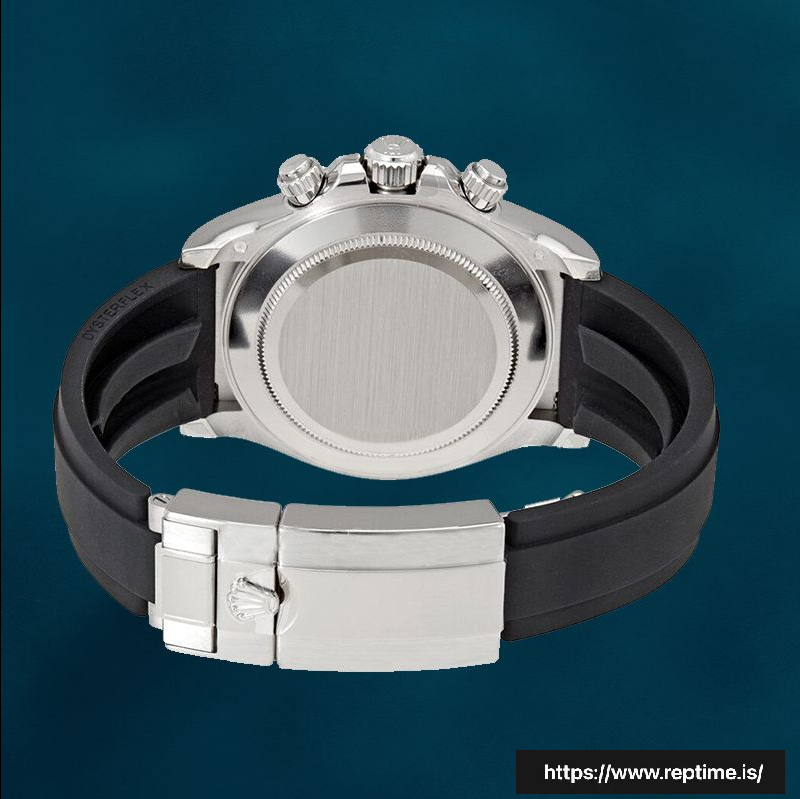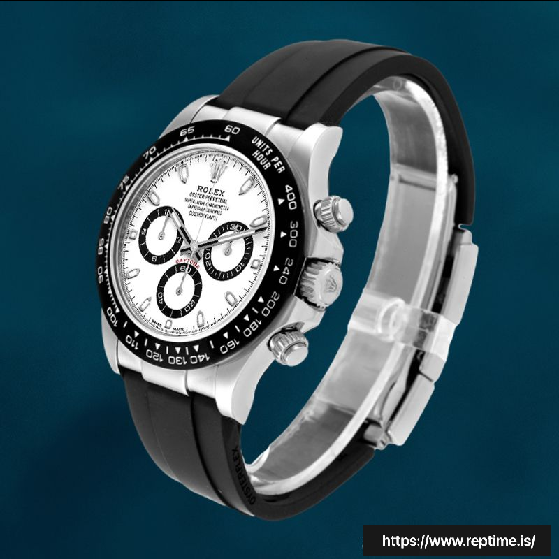 - White Dial with Black Sub-Dials: Clean white base, black chronograph sub-dials, luminous markers (Super-LumiNova), and red “Daytona” inscription, creating a bold, sporty contrast.
