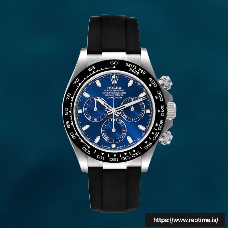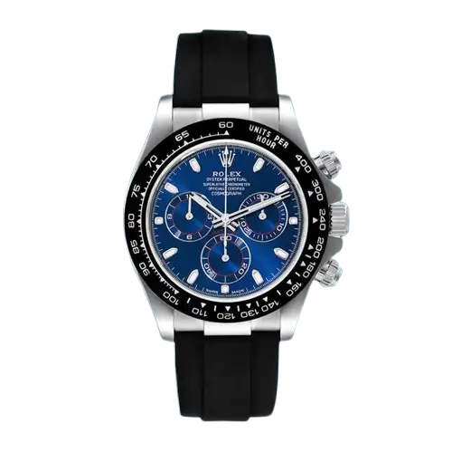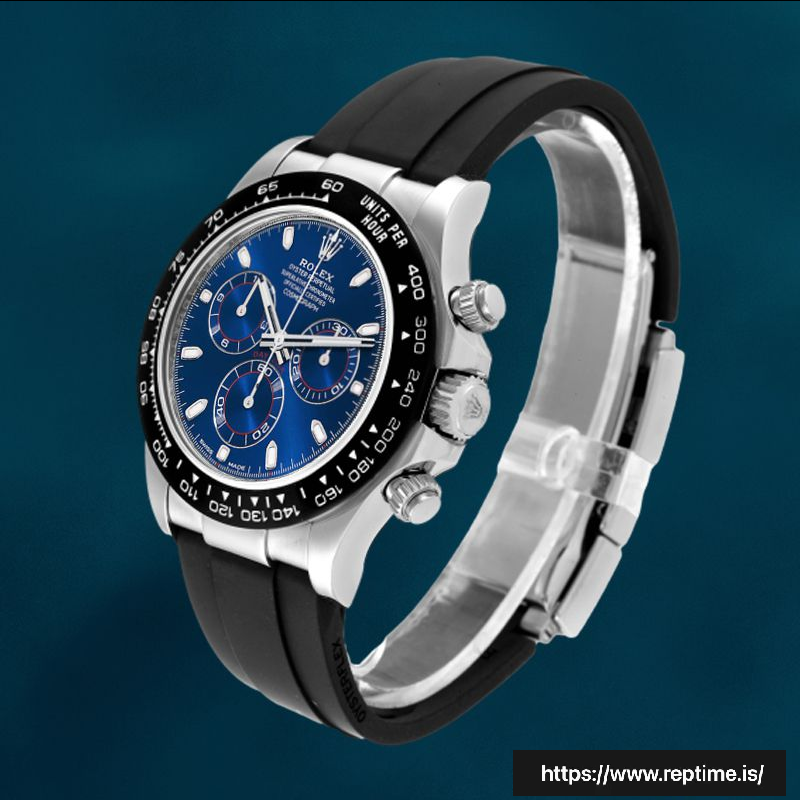 The Rolex Cosmograph Daytona features a 40mm stainless steel case paired with a striking blue dial that has red accents on the chronograph sub – dials. It is complemented by a black Oysterflex rubber strap, offering both comfort and durability. The black Cerachrom bezel with white tachymetric numerals not only adds to its sporty aesthetic but also provides functional speed – measuring capabilities. With its precise chronograph functions and Super – LumiNova – enhanced hands for low – light visibility, this watch is a perfect blend of performance and style. Meticulously crafted with detailed engravings and a convex sapphire crystal, it embodies Rolex’s legacy of precision and luxury, making it an ideal choice for both sports enthusiasts and those with a penchant for elegant timepieces.