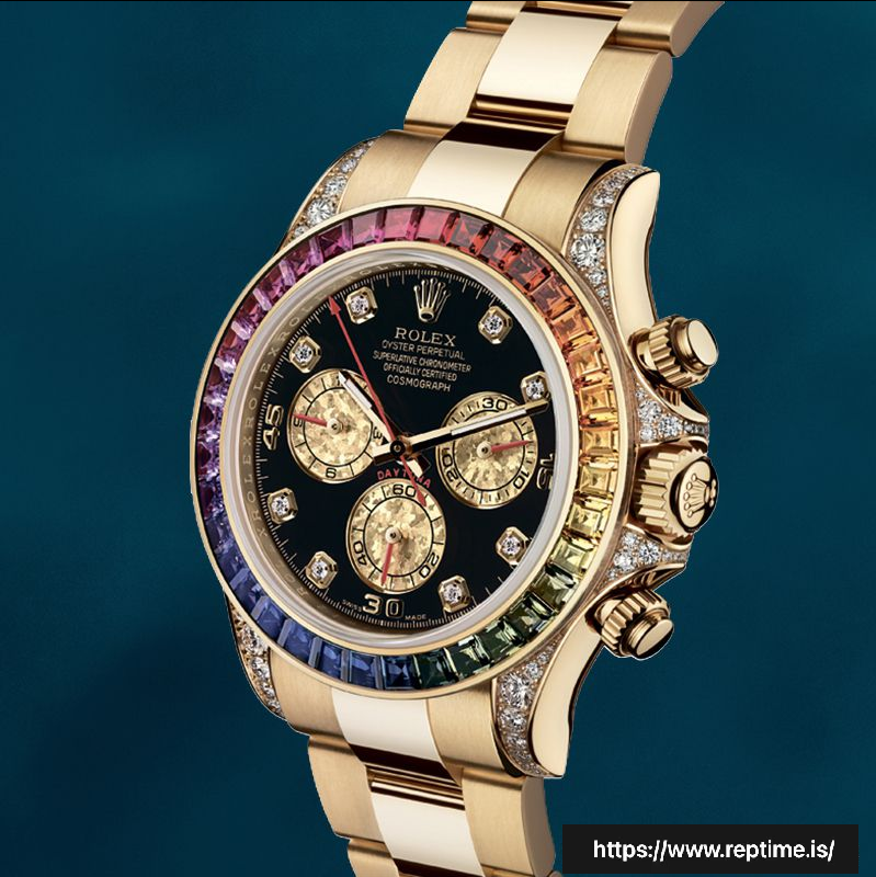 - Black Dial w/ Gold/Diamonds: Bold black base, gold chrono sub-dials, diamond markers, red “Daytona” text – striking contrast, sport-luxury fusion.