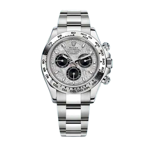 The stainless steel Rolex Cosmograph Daytona with a meteorite dial and black sub – dials is a remarkable timepiece. It seamlessly combines high – performance chronograph functionality (tachymeter, luminous hands) with luxurious stainless steel craftsmanship. The unique meteorite texture on the dial adds an exclusive touch, making each watch truly one – of – a – kind. Durable, versatile, and timeless, this Daytona embodies Rolex’s legacy of excellence, appealing to collectors and enthusiasts who value a perfect balance of performance and sophistication. Whether on the racetrack or in a formal setting, it stands as a symbol of Rolex’s unparalleled design and engineering, offering a refined yet bold statement in every situation.