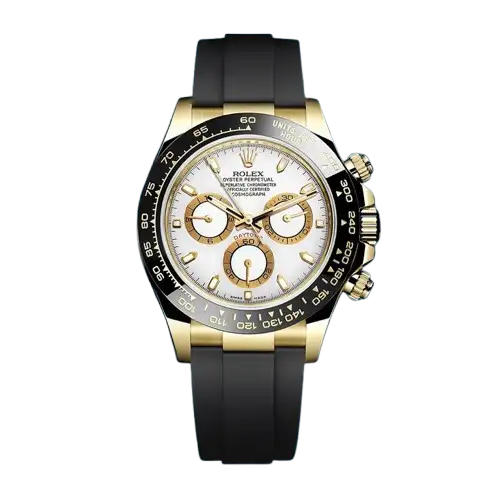 - Black Oysterflex Rubber Strap: Durable and comfortable, the black Oysterflex strap is paired with a gold and steel clasp, offering a modern, sporty look that’s suitable for various occasions.