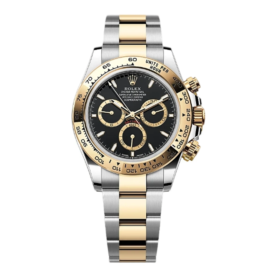 Rolex Daytona, two – tone (gold/steel), white dial with gold sub – dials, black rubber strap. Merges chrono precision (tachymeter, luminous hands) and sport – luxury (ceramic bezel, two – tone design). A sleek, versatile timepiece – perfect for both high – speed moments and elegant settings, embodying Rolex’s iconic blend of style and performance.