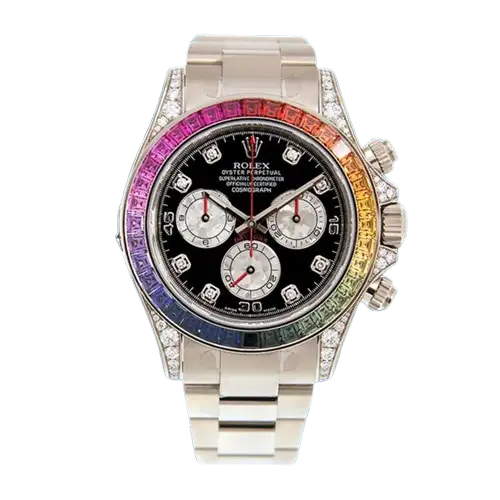 - Black Dial with Diamond Accents: The black dial provides a striking contrast to the colorful bezel. It features diamond – set hour markers and gold – toned chronograph sub – dials, with red accents on the hands and “Daytona” text for a sporty yet glamorous look.