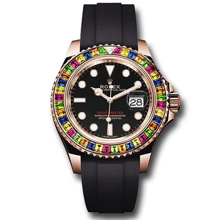 Dive into opulence with the Rolex Yacht-Master Everose Gold Rainbow Gemstone Bezel. This extraordinary timepiece redefines maritime luxury: the Caliber 3235 movement delivers chronometer-level precision, while the 18K Everose gold case and rainbow gemstone bezel create a dazzling visual spectacle. The black rubber strap adds sporty comfort, making it perfect for both yachting adventures and red-carpet events. Its 100m water resistance and unidirectional bezel (for regatta timing) underscore its practicality, while the gemstone accents celebrate Rolex’s craftsmanship. A must-have for collectors who demand the ultimate fusion of luxury, performance, and artistic design.
